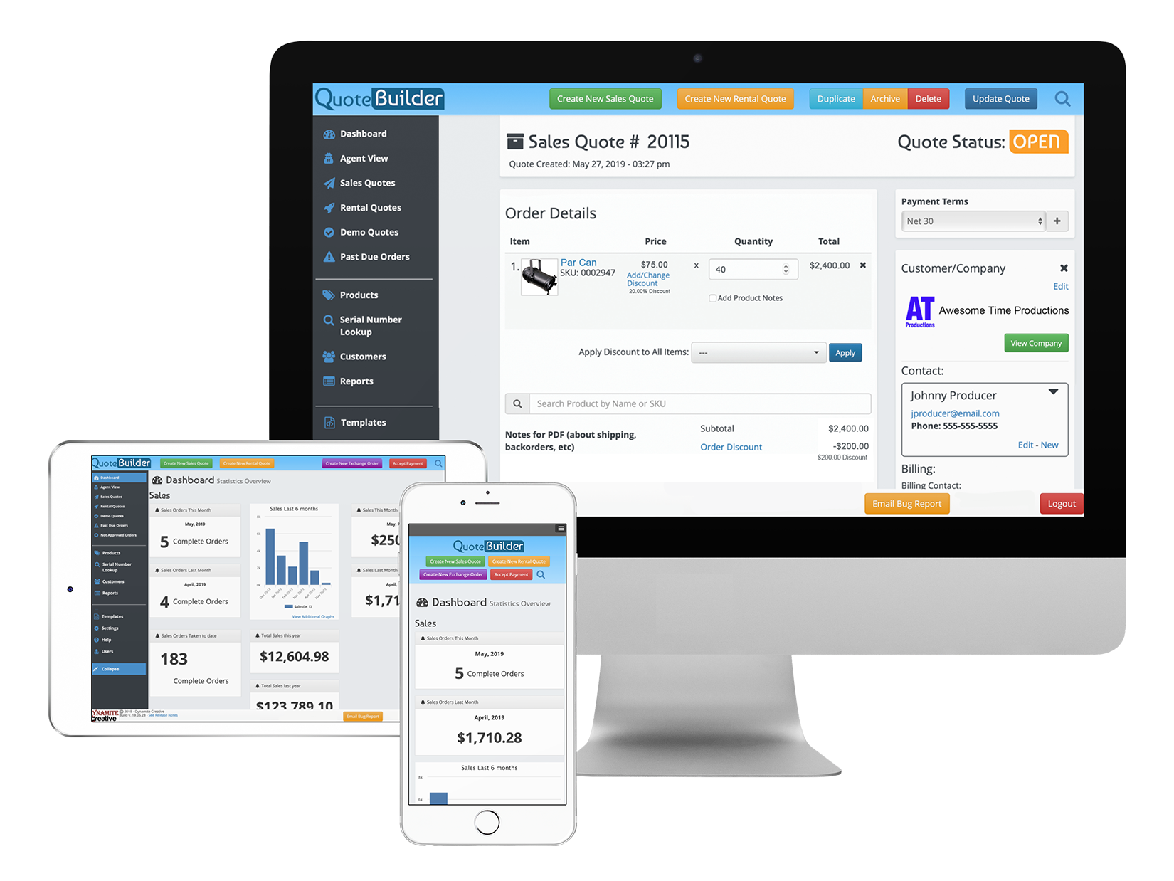 QuoteBuilder is a web-based application responsively designed specifically for the entertainment industries so that you can work across all your devices, allowing you to save time and money while also alleviating the stress and frustration of managing quotes and invoices for any size business whether you do sales, rentals, services… or all of them!